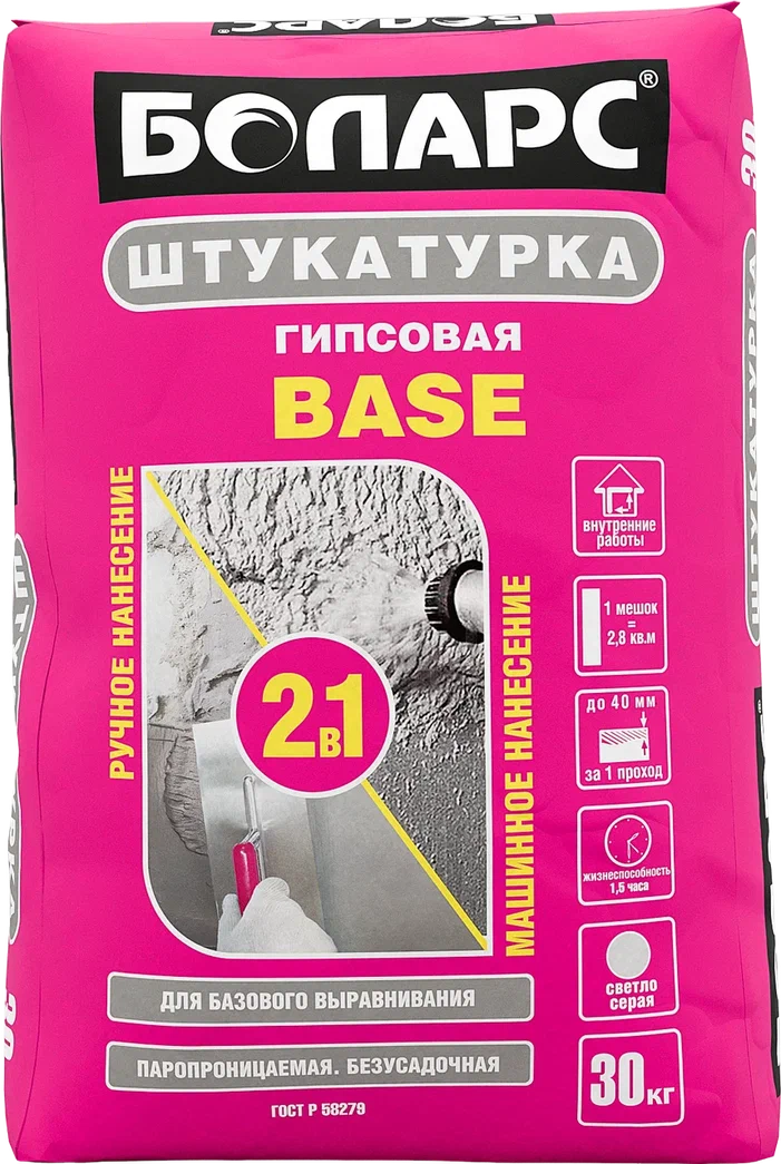 Боларс BASE — смесь штукатурная на гипсовом вяжущем. Применяется для выравнивания стен и потолков внутри здания. Предназначена для ручного и машинного нанесения.